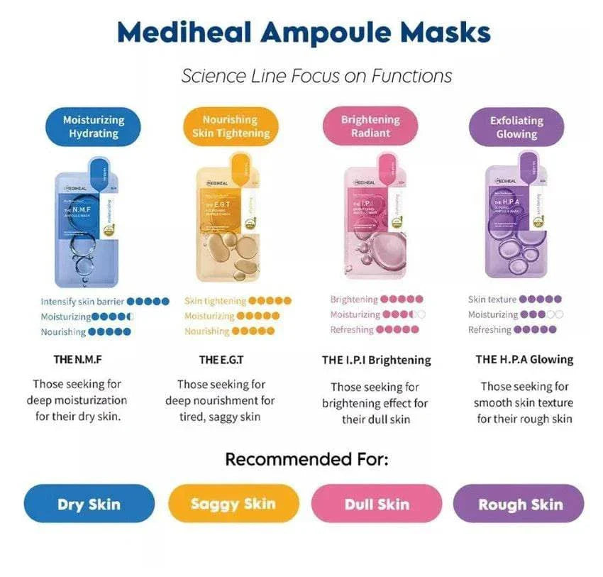The Mediheal N.M.F (Natural Moisturizing Factors) Ampoule Mask is your ultimate solution for deep, long-lasting hydration. Designed with an eco-friendly cotton and wool blend sheet, this mask provides an intensive moisturizing treatment that soothes dry, dull skin.