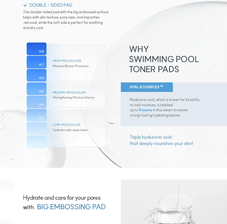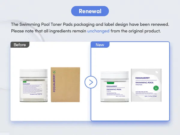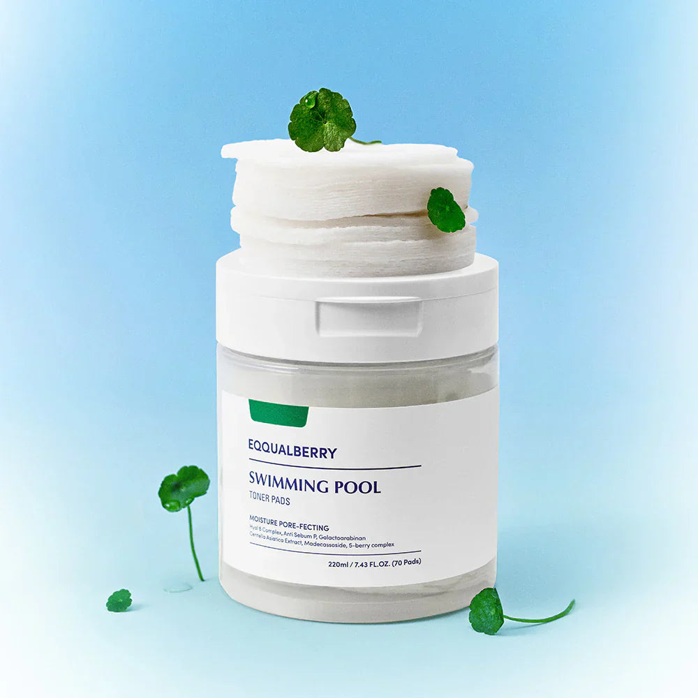 EQQUALBERRY Swimming Pool Toner Pads are gentle, dual-sided vegan pads designed to refine pores, exfoliate dead skin cells, and replenish hydration without irritation.