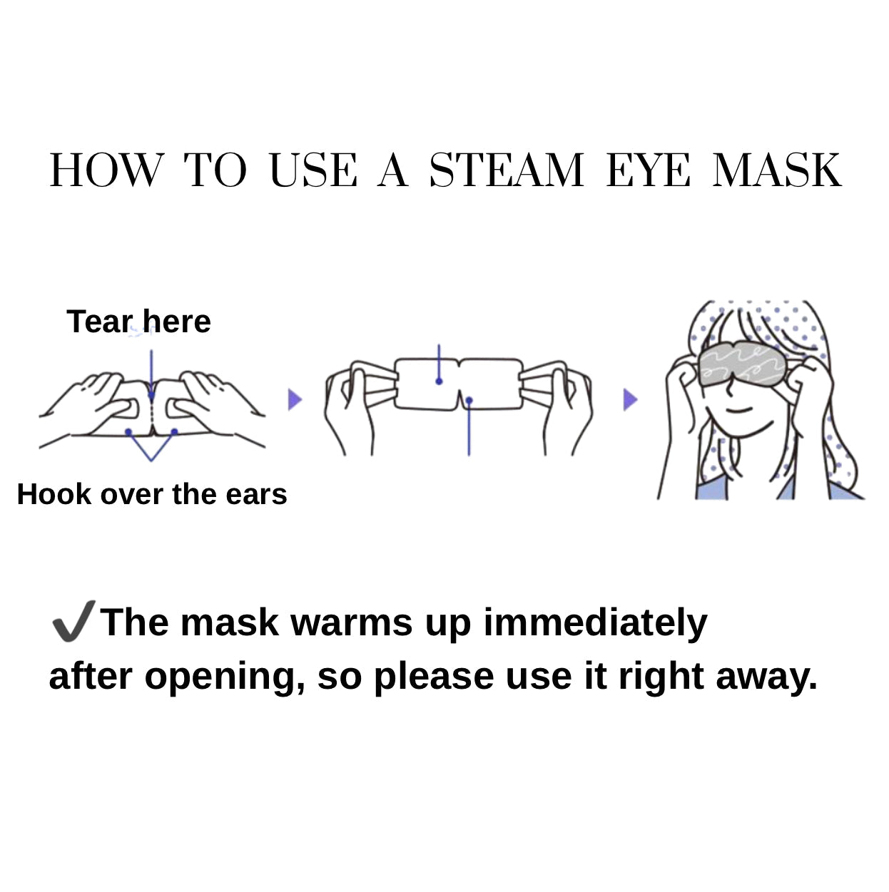***Do not use with other eye masks or devices. Make-up may be removed during use. Temperature and duration may vary depending on room conditions. The steam may expand slightly, but the mask can be used safely. Read all usage instructions carefully before use.