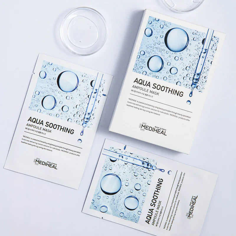 The MEDIHEAL Aqua Soothing Ampoule Mask is designed to deliver a powerful dose of hydration and nourishment to the skin. It features four different types of hyaluronic acid that deeply hydrate and strengthen the skin's moisture barrier. This soothing mask offers a cooling effect that helps reduce redness and irritation, leaving the skin feeling refreshed, plump, and radiant. The LYOCELL fabric used in the mask is both smooth and adherent, ensuring optimal essence absorption and enhancing the benefits of the formula.