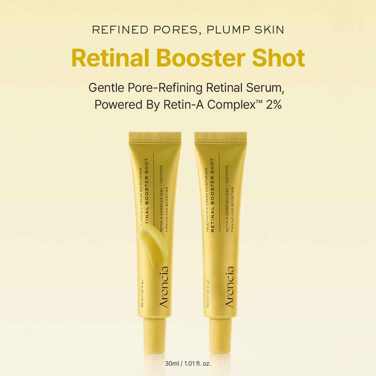 Experience visible skin renewal with the ARENCIA Retinal Booster Shot, a powerful yet gentle retinal serum powered by Retin-A Complex™ 2%. This advanced formula refines pores, improves elasticity, and smooths fine lines, delivering deep absorption through LDH nano-encapsulation and multi-liposome technology for minimal irritation and maximum results. Ideal for those seeking to enhance skin texture, firmness, and overall complexion, this serum supports long-term skin renewal with a smooth, lifted appearance.