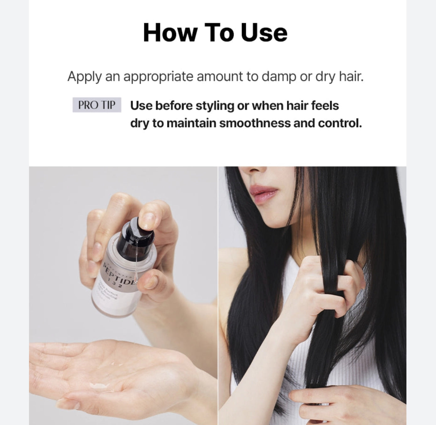 Apply an appropriate amount to dry or damp hair, focusing on mid-lengths and ends. Style as desired. Use daily or as needed for smooth, shiny hair.