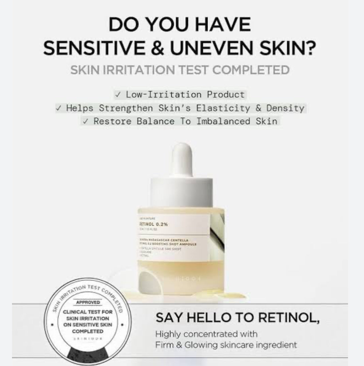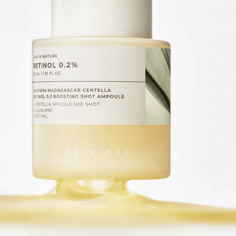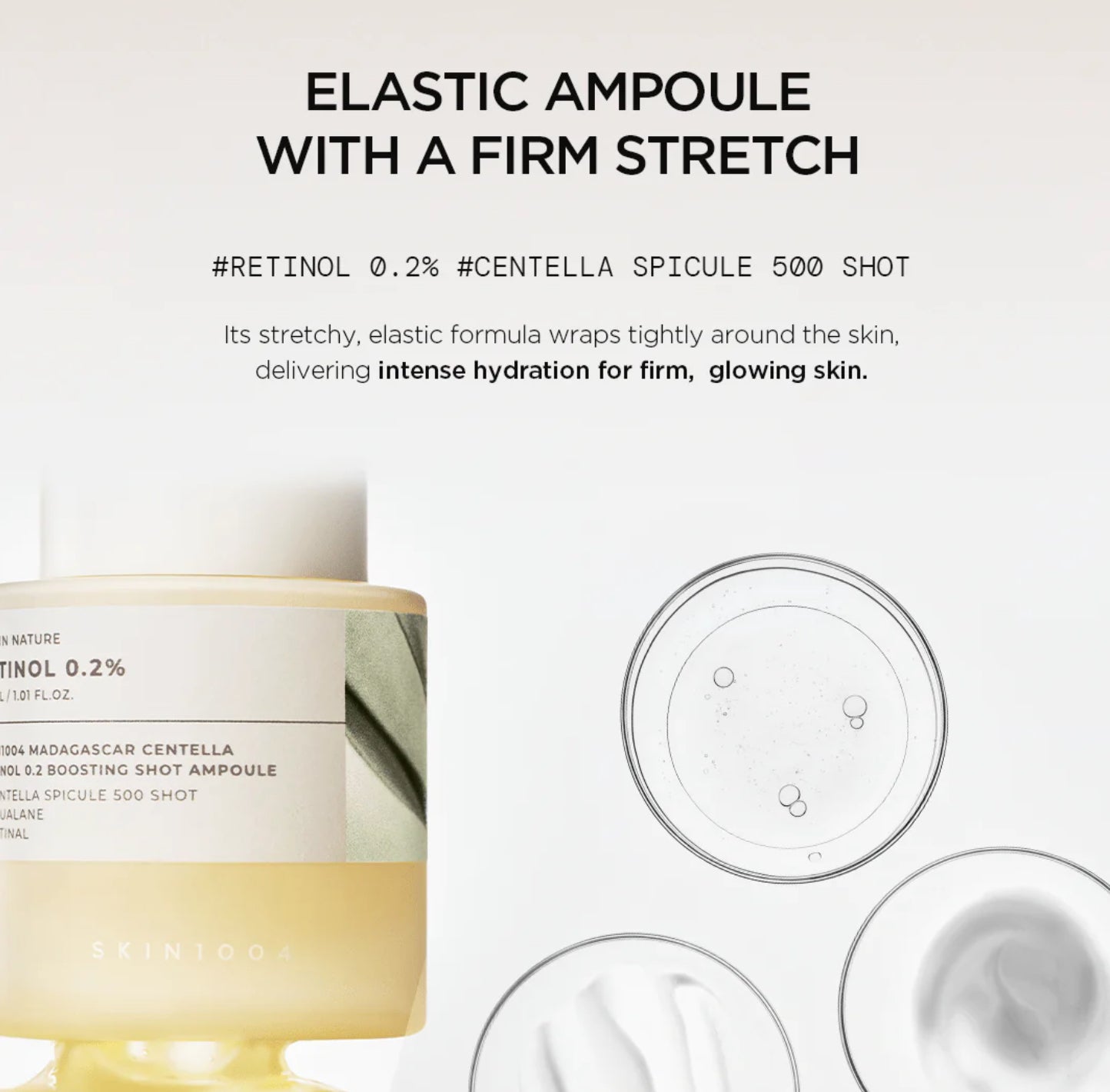 Achieve a smoother, firmer, more refined complexion with the SKIN1004 Madagascar Centella Retinol 0.2 Boosting Shot Ampoule. Powered by 0.2% Retinol, enhanced with Retinal and Squalane, this advanced formula helps improve elasticity, reduce the look of fine lines, and refine texture. The ampoule contains micro-spicules that create gentle absorption pathways, allowing active ingredients to penetrate more effectively. Infused with Centella Asiatica, Madecassoside, and botanical extracts, it helps calm and balance the skin while supporting a visibly renewed appearance. Perfect for those seeking a lightweight yet potent boost to their evening routine.