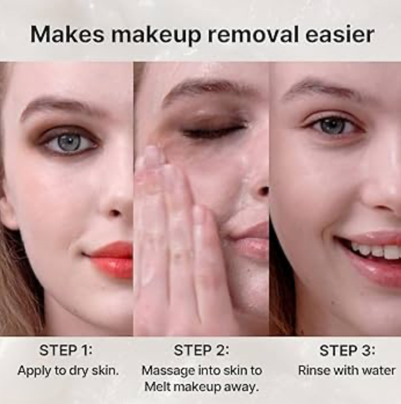 Scoop a small amount of cleansing balm with the spatula and massage balm onto dry skin until it melts into oil. Add water and continue to massage to emulsify oil into milk. Rinse off with water.