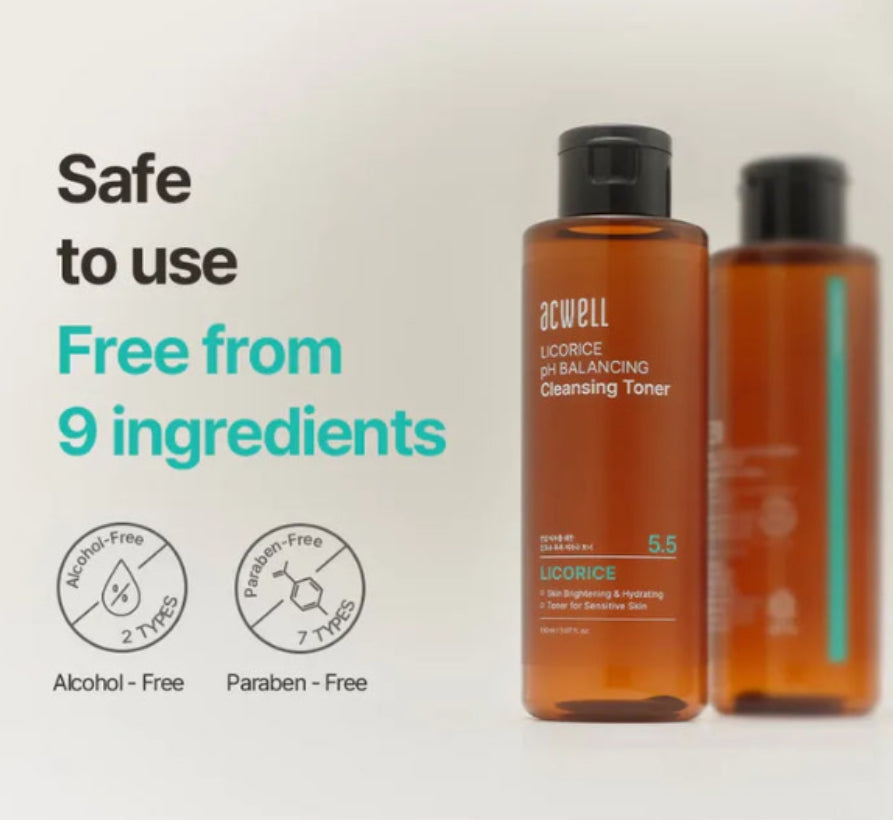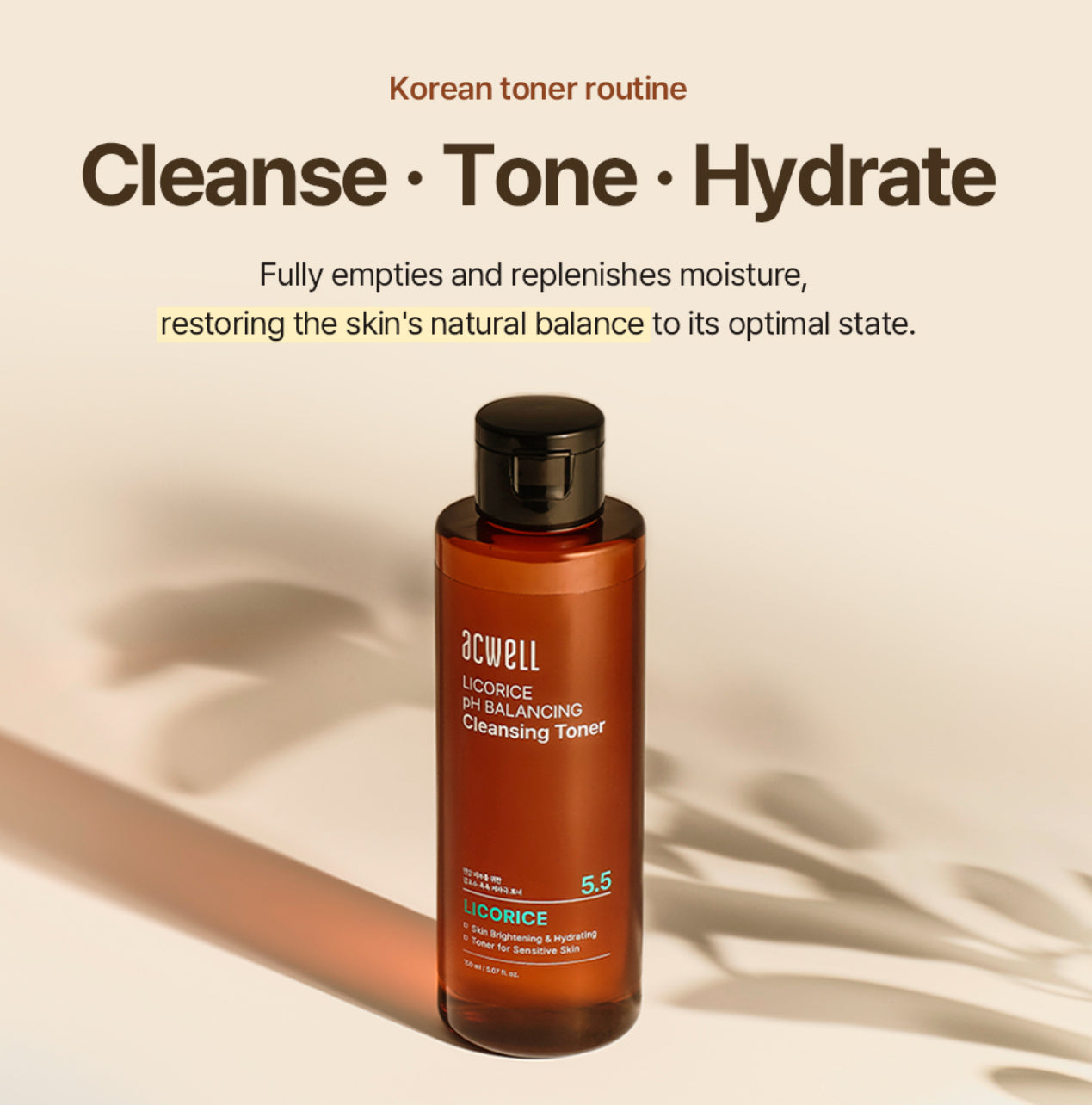 Acwell Licorice pH Balancing Cleansing Toner has a pH level of 5.5 which effectively balances and adds luminosity to the skin. It contains peony extract and a high concentration of licorice water, both known for their natural brightening properties. The inclusion of green tea extract helps to calm and reduce pigmentation, including acne scars and dark spots. After use, skin feels clean and smooth without any dryness or tightness. Its ability to remove impurities allows for better absorption of subsequent skincare products. For optimal results and benefits, pair with the Licorice pH Balancing Essence Mist.
