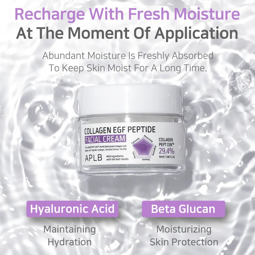 Revitalize and plump tired, sagging skin with the APLB Collagen EGF Peptide Facial Cream, powered by COLLAGEN PEPT CEN™ (29.4%). This deeply hydrating formula helps improve elasticity while keeping irritation low, making it ideal for sensitive skin. Enriched with Hyaluronic Acid, Shea Butter, Eggplant Extract, and Centella Asiatica Extract, it restores moisture, softens rough texture, and nourishes weakened skin barriers. The gentle, pH-balanced formula also uses advanced technology to protect active ingredients for safe and effective absorption — all without added fragrance.
