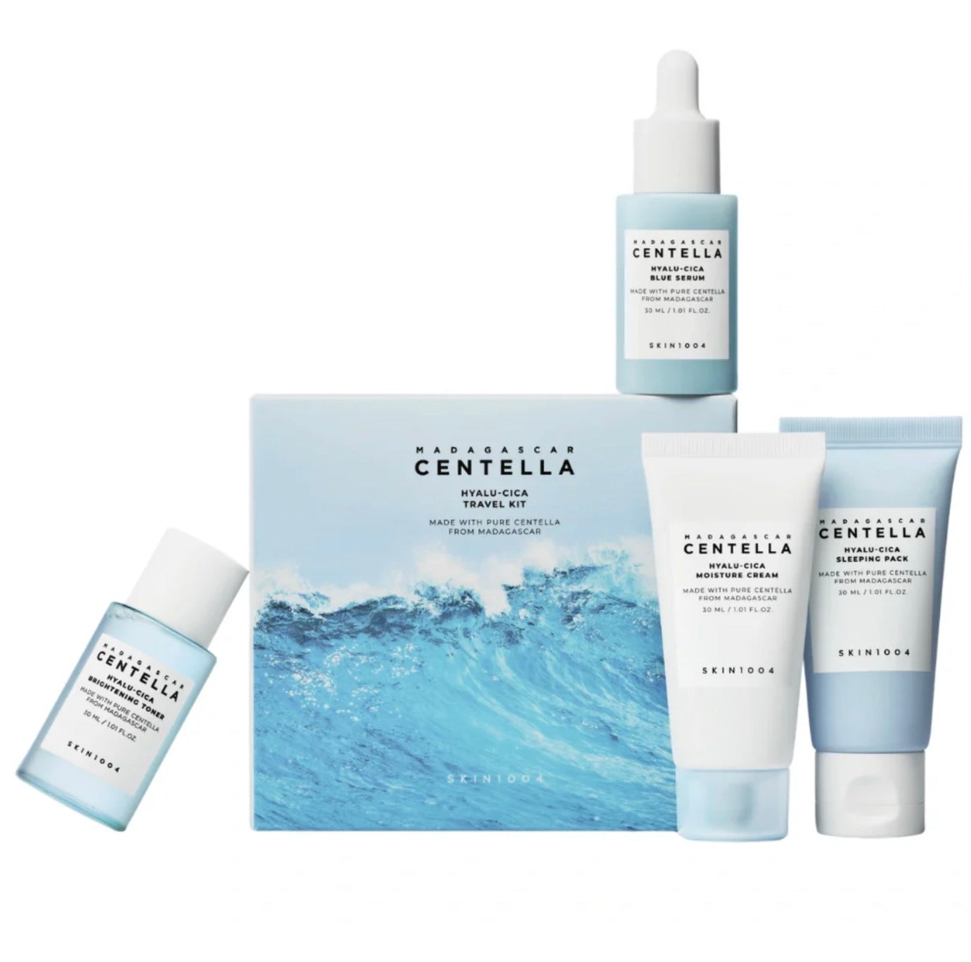 SKIN1004 Madagascar Centella Hyalu-Cica Travel Kit 120ml provides a complete skincare routine in convenient mini sizes, ideal for travel. This kit contains four essential products designed to hydrate, soothe, and rejuvenate your skin. The Madagascar Centella Hyalu-Cica Brightening Toner Mini 30ml is a multi-purpose toner that gently removes dead skin cells and impurities, while soothing and calming skin irritations with the power of AHA and LHA. The Madagascar Centella Hyalu-Cica Blue Serum Mini 30ml is a hydrating serum formulated with five types of Hyaluronic Acid and Ceramide to boost moisture levels and calm sensitive skin. The Madagascar Centella Hyalu-Cica Moisture Cream Mini 30ml is a rich, skin-drenching moisturizer that contains Centella Asiatica Extract and plant-based collagen to hydrate, soothe, and improve skin elasticity. Lastly, the Madagascar Centella Hyalu-Cica Sleeping Pack Mini 30ml is a multi-tasking mask that provides long-lasting hydration and leaves the skin smooth, rejuvenated, and radiant.